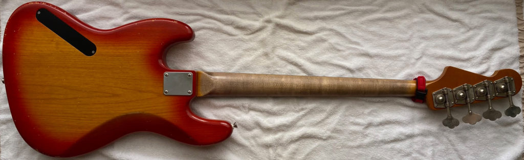 1964年のジャズべの完コピモデルを作ろうと思って国産メーカーにオーダーしたのですが、当時も今も、もうベースのボディの大きさで1ピースのアルダーは木取りが出来ないらしく、オーダーを受け付けてもらえず。結果、アッシュ&エボニーになりました。それならばリアピックアップを’70の位置にすればよかったと後から後悔したものです。