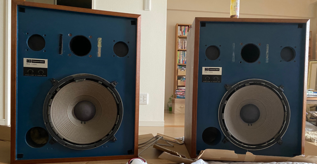 箱はプロモニター用ですが、構成ユニットはL300とかの民生用のものを搭載しているという内容になっています。JBLのプロモニターシリーズを家庭でうまく鳴らせる自信がなかったので、見た目だけミーハー的にそれっぽいが、中身は鳴らしやすい(実際にはプロ用より民生用のが家庭では音は良いと思う)ユニットという珍しい機体にピンと来てしまった。