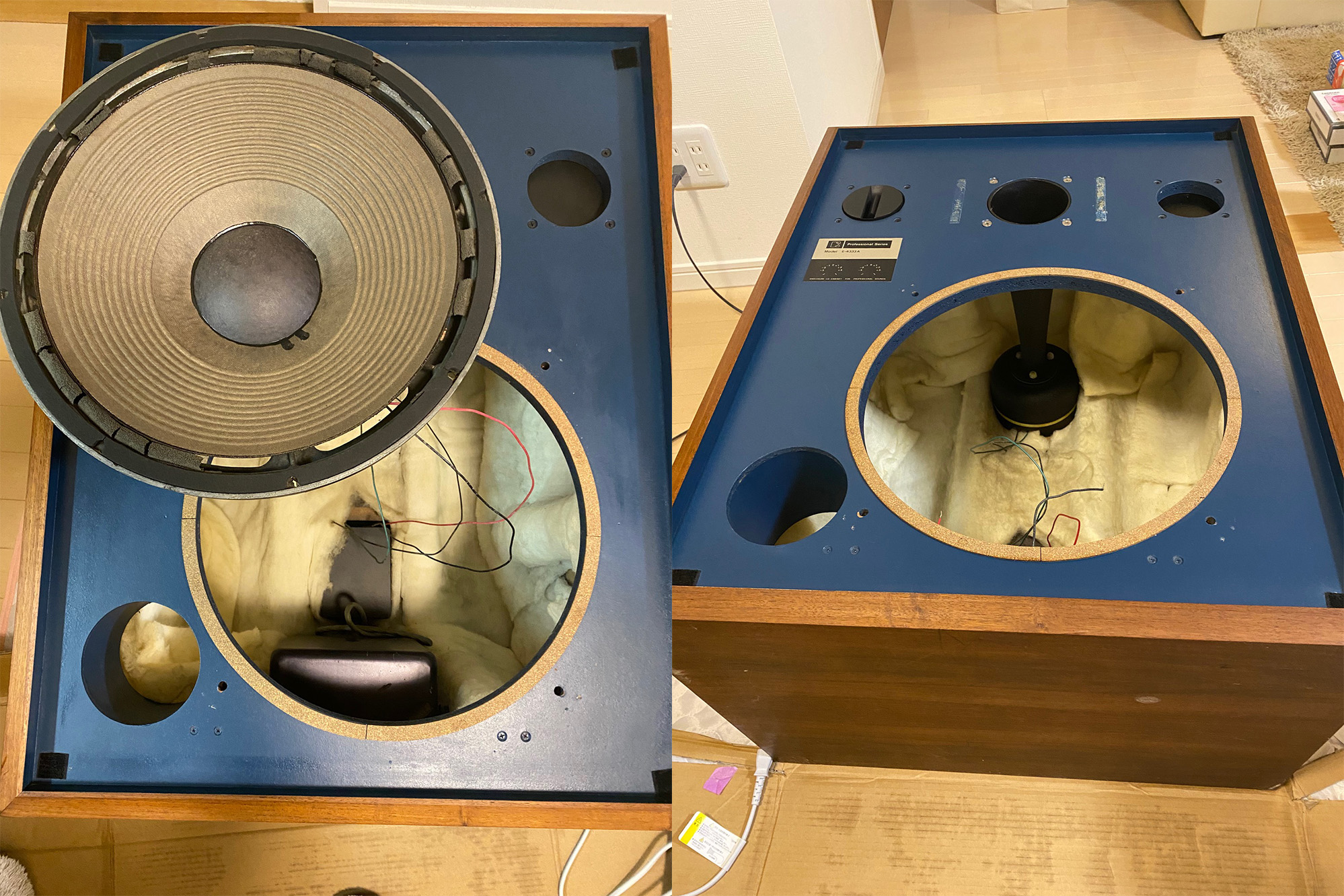 たぶんキャビネットは山水電気製。材料はJBLから取り寄せて日本で作ったっぽい。海外国内のネット記事で見受けられる塗装や造りの雑さがなく、丁寧な造り。